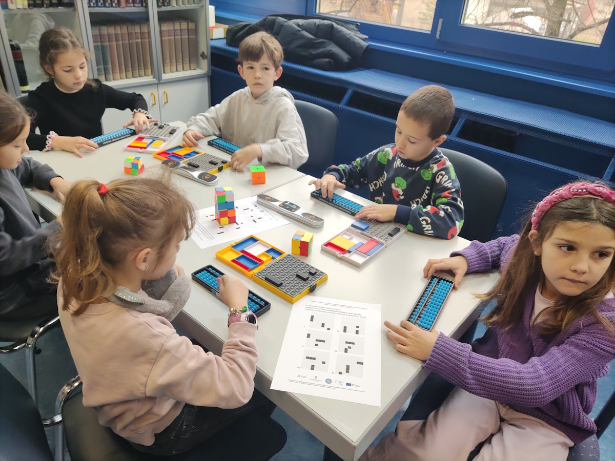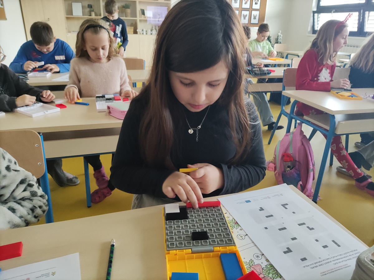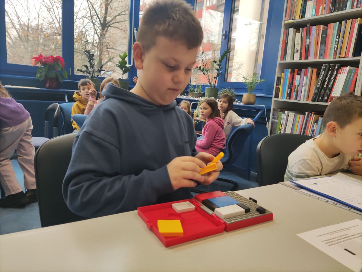 U završnom dijelu radionice učenici su rješavali Mondrian Blocks zadatke. Označavali su crna polja i pokušavali popuniti cijelu ploču logičkim slaganjem elemenata, što je poticalo prostorno zaključivanje, planiranje i strategijsko razmišljanje.