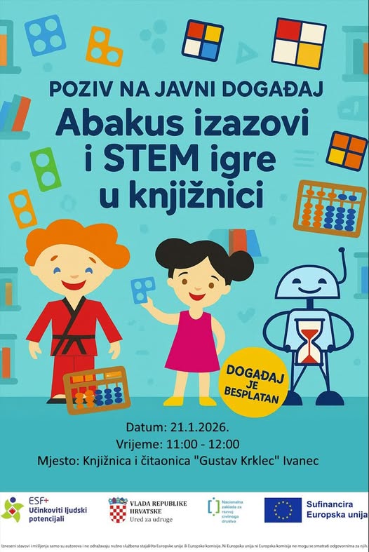 U sklopu projekta Abakus tradicije za digitalne ambicije, Udruga Abacus Hrvatska organizira javni STEM događaj u prostoru Gradske knjižnice – namijenjen djeci koja žele upoznati inovativne načine učenja matematike kroz tehniku japanskog abakusa – sorobana.