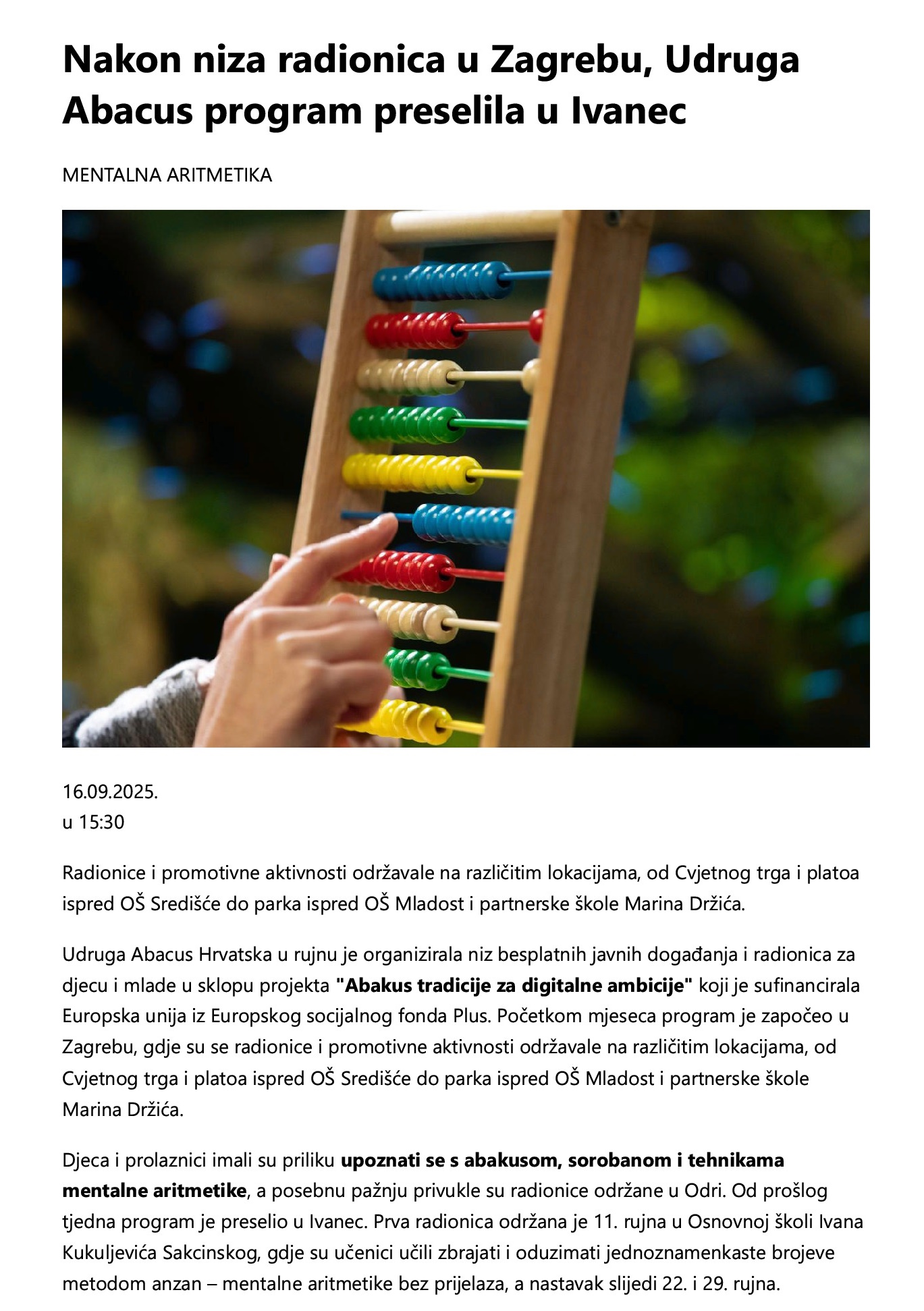 🔗 večernji.hr – Nakon niza radionica u Zagrebu, Udruga Abacus program preselila u Ivanec