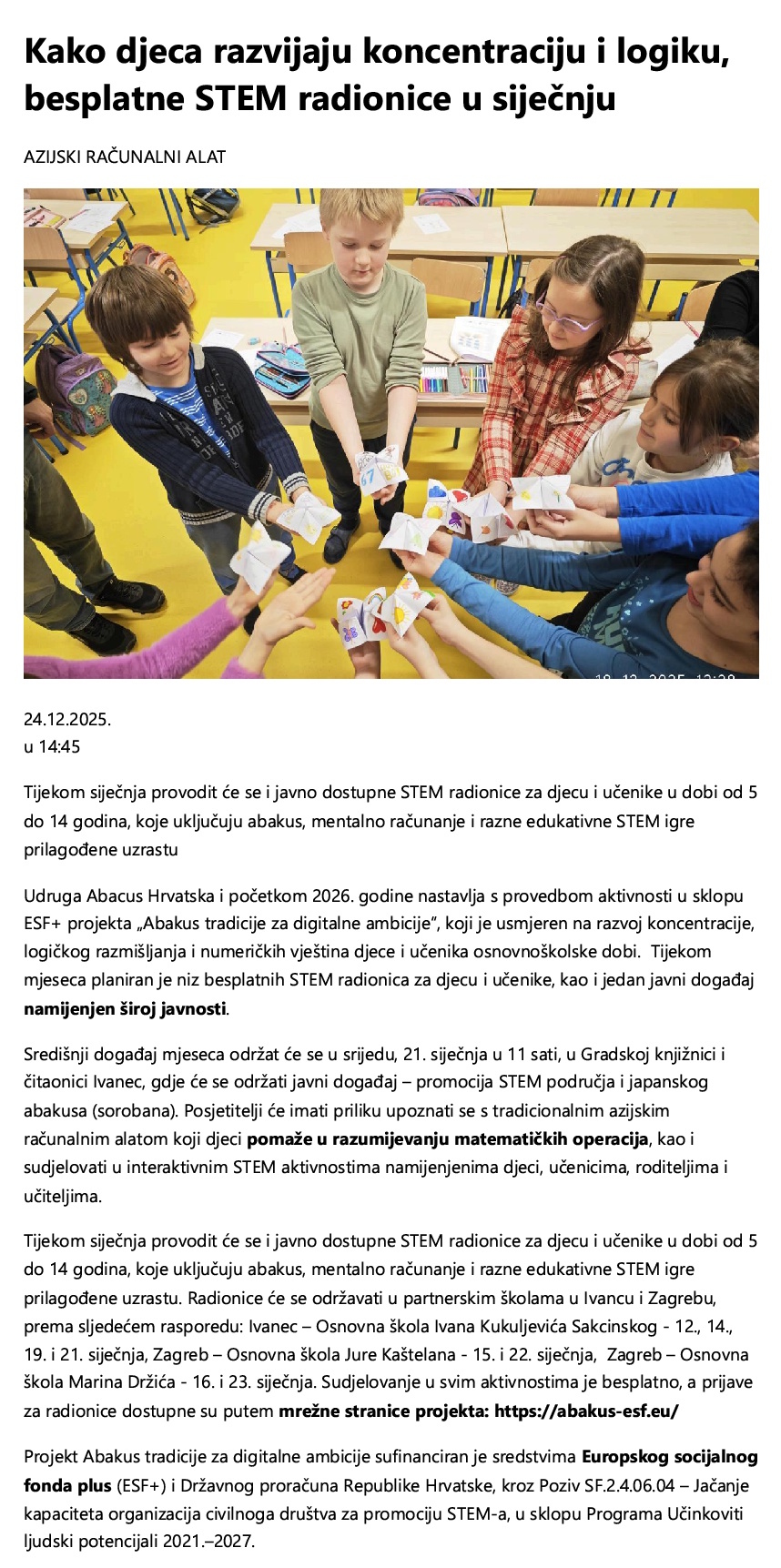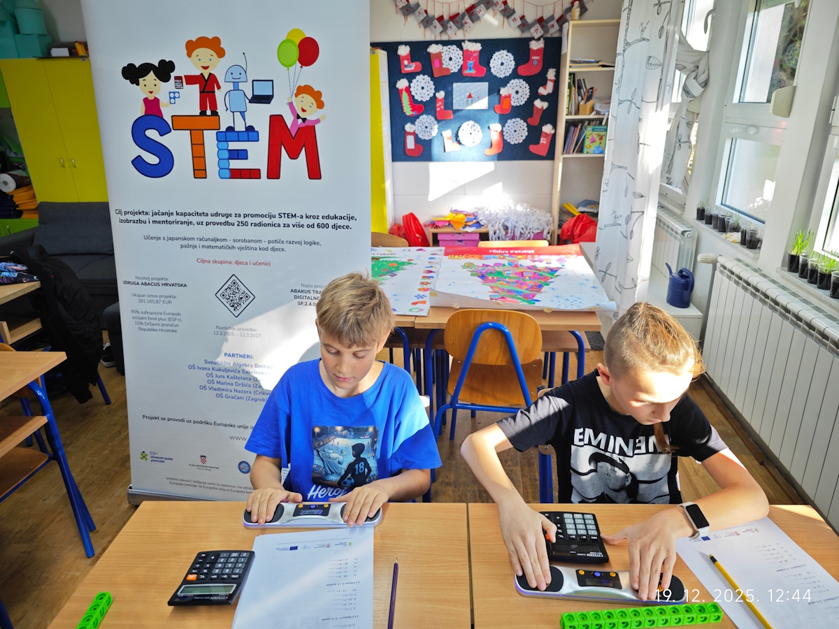 Projekt Abakus tradicije za digitalne ambicije sufinanciran je sredstvima Europskog socijalnog fonda plus (ESF+) i Državnog proračuna Republike Hrvatske, kroz Poziv SF.2.4.06.04 – Jačanje kapaciteta organizacija civilnoga društva za promociju STEM-a, u sklopu Programa Učinkoviti ljudski potencijali 2021.–2027.