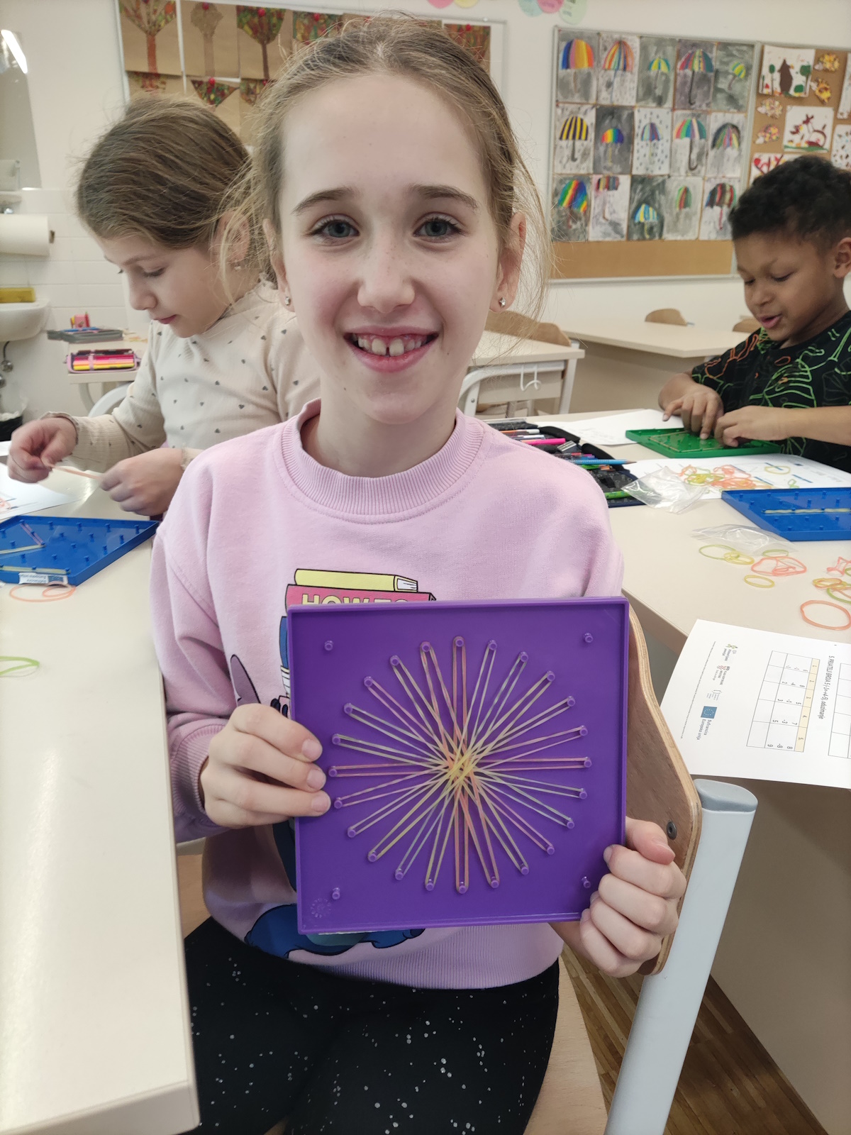 Radionica je započela radom na geo pločama. Djeca su pomoću gumica oblikovala slova S, T, E i M te tako uvježbavala finu motoriku, preciznost pokreta i prostornu percepciju, uz istovremeno upoznavanje pojma STEM kroz praktičnu aktivnost.